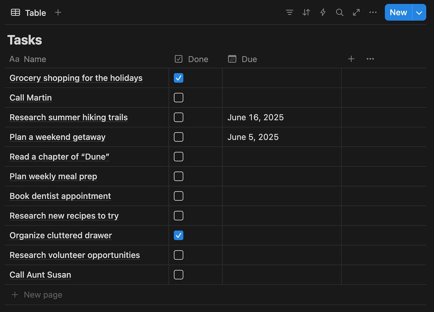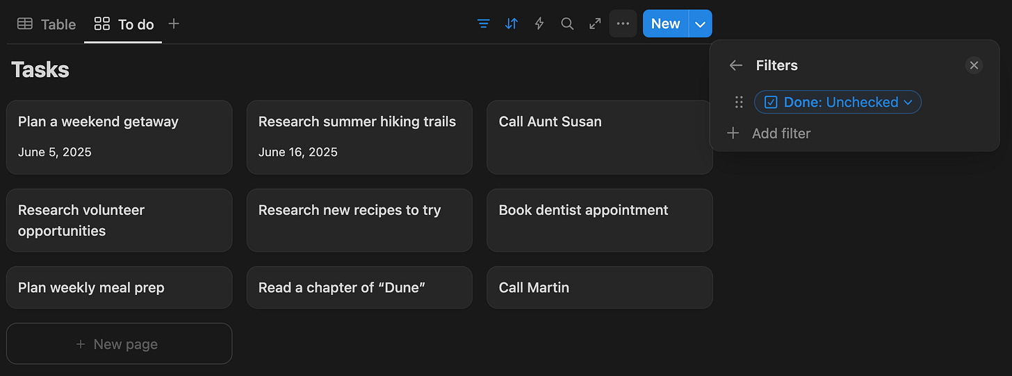 For example, to make a task database, you’d give every record a “Done” property – a checkbox. In the Eisenhower Matrix paradigm, every task would have two additional properties: one saying if the task is urgent, the other – if it’s important.